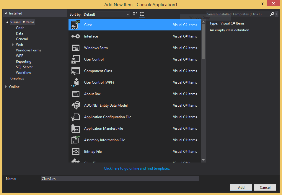 Add a new Class to the project by right-click the project and go to Add and then select Class.