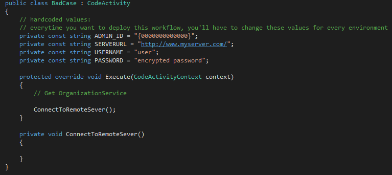 As you know that magic strings can lead to painful problems. For example, these credentials might only work in certain environments but will not work on others. So we need a better way of changing the credentials without opening the plugin and recompiling every time before deployment.