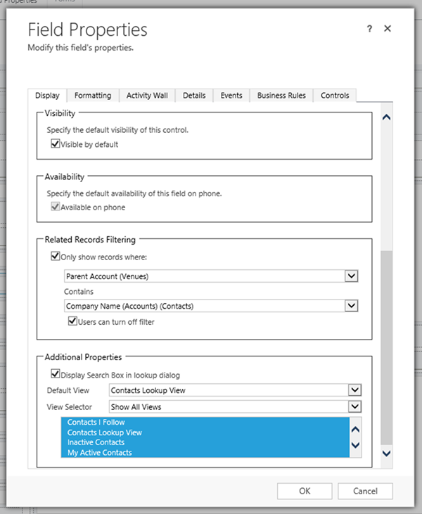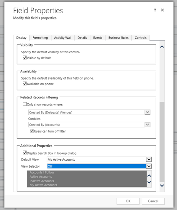 The other way to filter a lookup in an out of the box manner is to change the available views for the lookup. Custom views can be added and specified for a lookup in Dynamics 365, which allows for a greater degree of specification and versatility when displaying options for a lookup. In this example, we have a requirement to only allow a user to select accounts for the Venue to be accounts that they own. To accomplish this, we can change the Default view on the Lookup to be ‘My Active Accounts’, which allows the user to only see active accounts that they own.