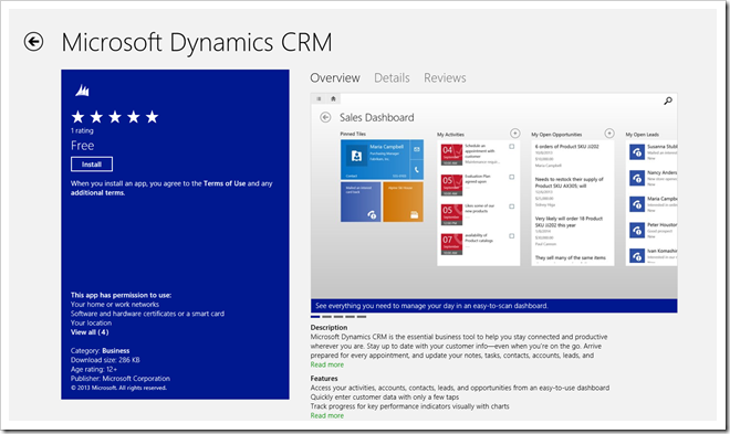 Microsoft Dynamics CRM is the essential business tool to help you stay connected and productive wherever you are. Stay up to date with your customer info—even when you’re on the go. Arrive prepared for every appointment, and update your notes, tasks, contacts, accounts, leads, and opportunities while the details are still fresh in your mind. Requires Microsoft Dynamics CRM 2013.