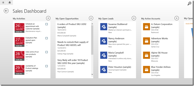 Once MoCA has initialised, the Sales Dashboard will be displayed (when using a CRM 2013 trial sign up) as shown below.