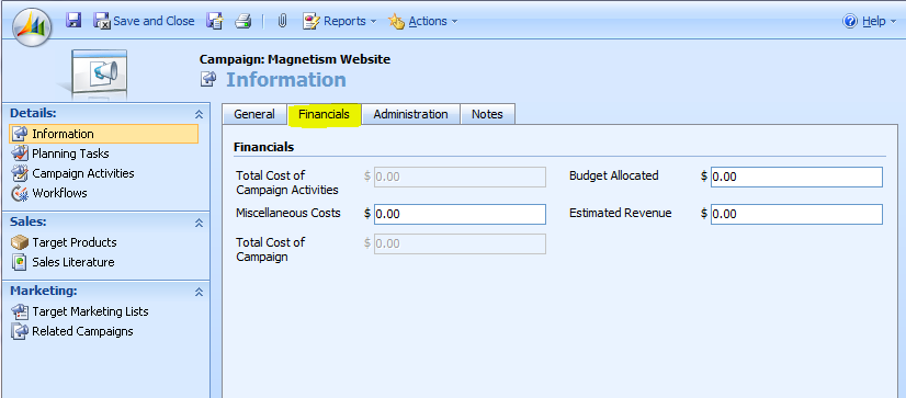 As you save these Campaign Activity records, Dynamics CRM 4.0 will automatically calculate and display the following information in the financial tab of the Campaign record: