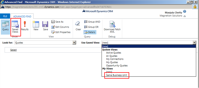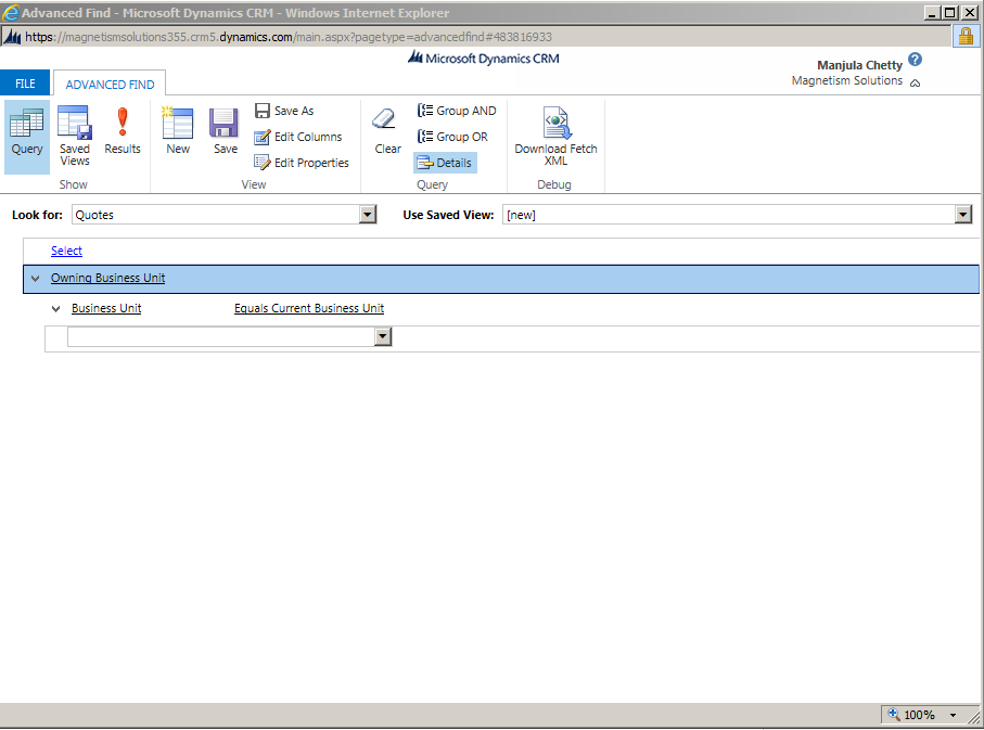 All the fields related to the Business Unit will be displayed in the next row. Select Business Unit equals Current Business Unit so we can find all the quotes belonging to the business unit as the current user. Click on Results and you will see all the quotes which are created by users who belong to the business unit as current user.