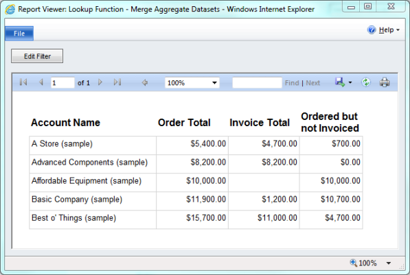 In the following scenario I wish to look at a list of Accounts and see their total amount Ordered, total amount Invoiced, and amount Ordered but not yet Invoiced.
