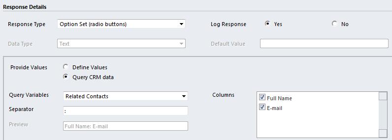 Next add your Page, and Prompt and Response to your Dialog. You can then set the properties of the prompt and response, and select either Option Set (radio buttons) or Option Set (picklist), which basically means you can display the results in a standard option set list, or in a list of radio buttons. Once you select the Option Set Response Type, the fields below will become active, where you can ‘Provide Values’ from the option ‘Query CRM Data’. This will allow you to select the query you just created.