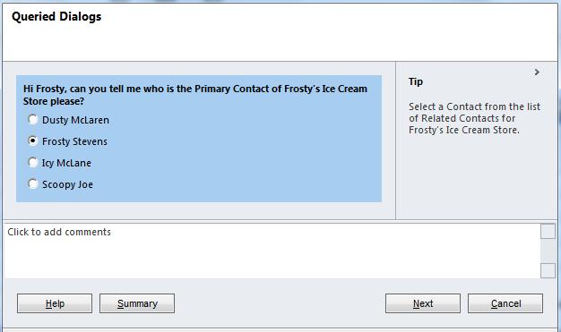 You can also query any other data in CRM that an advanced find would allow you to do. This means you can return results from records that are not only related to the entity you’re running the dialog on. For example, you could create a query for all Accounts with a relationship of Customer in your system, and then display those within the Dialog for a user to select from.