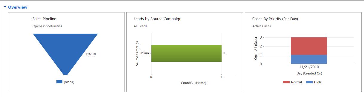 With the release of Dynamics CRM 2011 comes a fantastic new dashboarding feature which allows the end user to create their own dashboards, and also interact with them in order to drill down into important data. Firstly, let’s take a look at what the dashboard looks like.