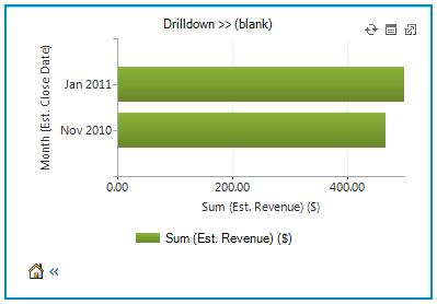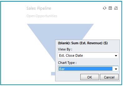 Now here’s where the real intelligence begins. I can further drill down into this chart simply by clicking on it, and selecting the data I wish to display in a new chart. I can also specify the chart type to use for the new chart. Let’s say I want to view the estimated revenue as well as the estimated close date for all open opportunities in a bar chart. I can do this easily by selecting the options displayed below.