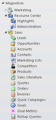 Clicking on Magnetism gives us another way to interact with our CRM data. It hides all unnecessary Outlook-only options from the navigation pane, and also displays views relating to the selected entity inside the workplace.