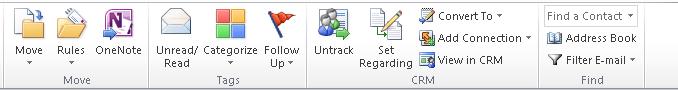 The “Home” tab includes an area dedicated to CRM 2011. “Track in CRM” has now been replaced with a “Track/Untrack” button. The area also allows you to convert an e-mail into an Opportunity, Lead, or Case record, or even create a new connection in which case you can relate the e-mail to your own user record or another record in the system.