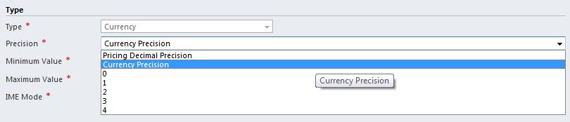 Field Level Precision: This allows you to set the precision for a specific money field. Simply open up the money field definition in the customization area and select the precision type. You are able to use the Pricing Decimal Precision (set in system settings), the Currency Precision (set for the currency that this money field is related to), or specify the precision yourself for this field by choosing a value between 0 and 4.