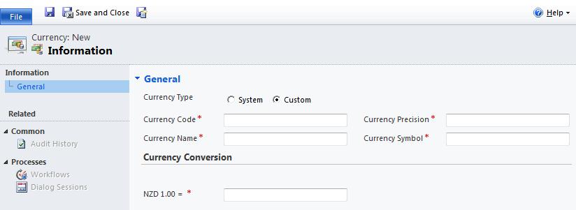 You are still able to do this within Dynamics CRM 2011, but you can skip this lookup step and create your own custom currencies. Notice how the Currency Code field is no longer a lookup when the Currency Type is set to “custom”. This allows you to define your own currencies, should they not be available in the list of available currencies supplied upon installation.
