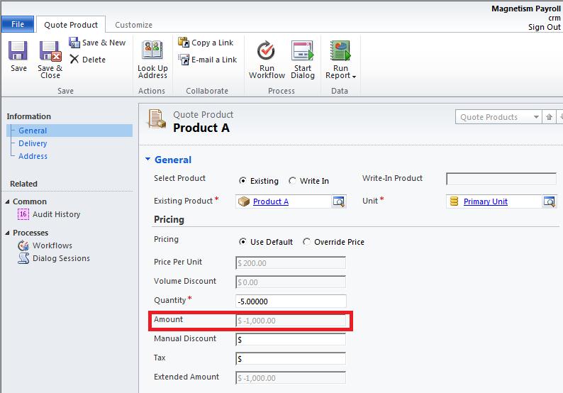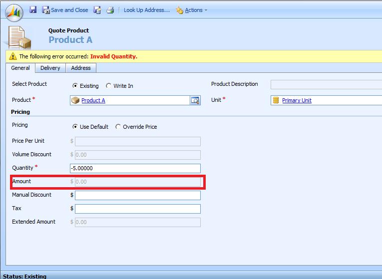 Negative pricing allows you to credit back your customers if they choose to return a specific product for example. In Dynamics CRM 4.0, I tried to modify the Price Per Unit and Quantity attributes on the Quote Product entity, to allow negative values, however when creating a new Quote and adding an existing product to the Quote with a negative quantity, CRM was unable to calculate the Amount correctly, and the value was displayed as zero.