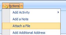 The image above shows the Accounts grid toolbar in Dynamics CRM 4.0. Notice that none of the options described above are available in this toolbar. However, when we open up an Account, we are able to attach a file by clicking on Actions -> Attach a File.