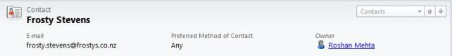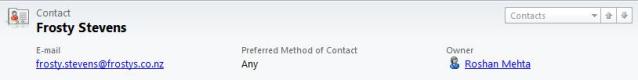 Firstly, the image below is what an e-mail address field looks like in the header of the Contact form. Notice that it is displayed as plain text, and we are presented with the default cursor which indicates that this area is not clickable like the Owner field. It would be nice if we could have a clickable link which would open up our default e-mail browser and automatically prefill the To field with the e-mail address of the Contact.