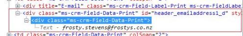 We can see here that we have a main div tag with id header-emailaddress1_d. Inside this is another div without an id which contains the e-mail address as plain text. It would be nice if the inner div tag had an id so we can refer to it directly, but we can still reference it in relation to the outer div.