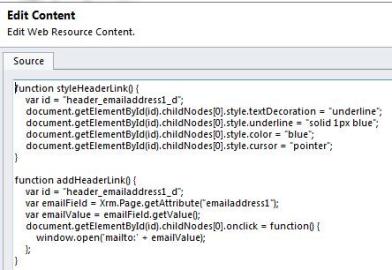 Dynamics CRM 2011 introduces the ability for system customizers to add fields to the header and footer of each customizable CRM form. This is especially useful for displaying important information about a particular record at the very top of the form and perhaps includes summary information at the bottom. However, I noticed that when you add an email address or URL field to the header, they are represented in text format and are not clickable like the fields themselves. Thankfully, there are ways around this!