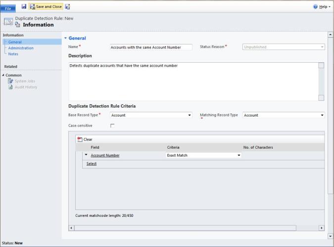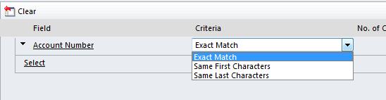 I have created a simple rule here which will check for duplicate Account records based on the Account number. Notice in the criteria, I have selected “Account Number is an Exact Match” but I have the ability to select the following criteria rules: