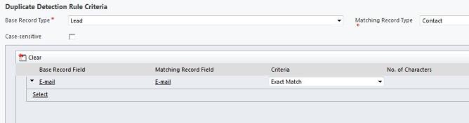 As you can see, it’s slightly different. We need to select fields for both the base record and the matching record. After we publish the rule, the system will detect duplicates between the Lead and Contact entities.