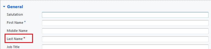 The image above shows that the Last Name field is “business required” marked with a red asterisk. The User will not be able to save the record without entering a value for this field. The First Name is “business recommended”, marked with a blue plus, which basically tells a User that they should input data into the field if they have that information.