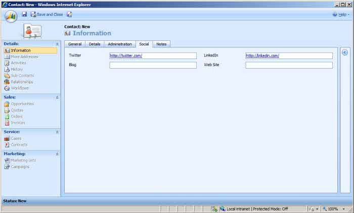 Another big thing that I did was add a new tab to the contact form called Social and within that tab added 4 fields; Twitter, LinkedIn, Blog, and Website.