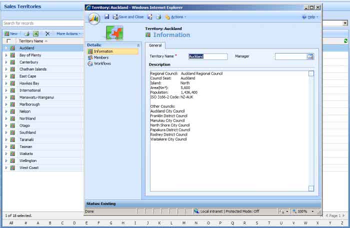 The last thing I did was add New Zealand Territories to the sales territories in the settings pane and in the description I put details about the territory.