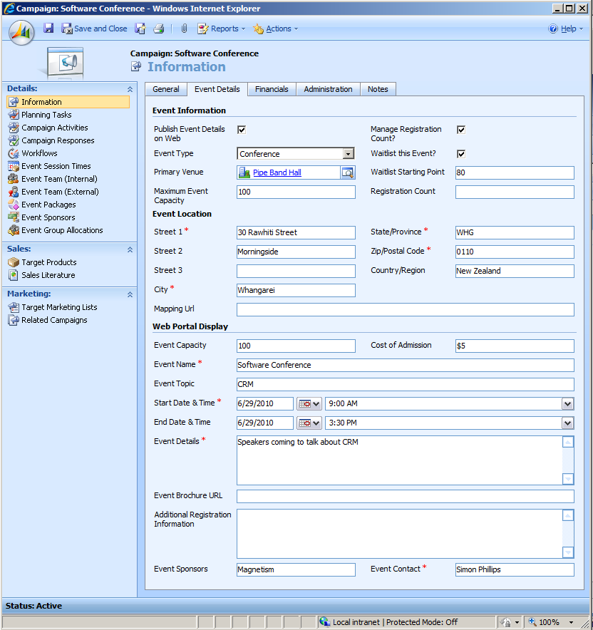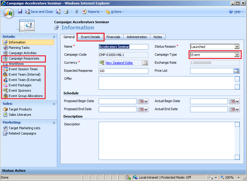 Please note: If your system already has customizations to the campaign or campaign response forms that this will over ride them as they are the two main forms that are used in this accelerator as well as a lot of custom entities. This accelerator will track the time, location, price (if any), organiser, presenters, catering (if any), and attendees; and then after the event you can go through and mark who attended and who didn’t for reporting purposes.