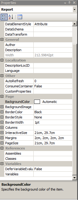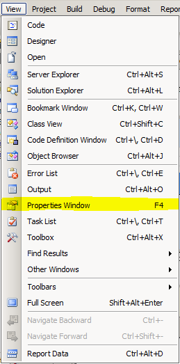 To be able to change all this you need to have available the properties pane, to open it you can go to ‘view>properties window’ or just use ‘F4’. From within that pane you can access all the different options for changing how the report looks and feels. Also with the drop down at the top you can change what you are editing. To make the report blends into CRM you need to find out what colour they use, from the SDK I found that they use the colour ‘#D6E8FF’.