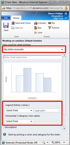 Let’s start with how to create these charts (Only people with the security role to edit entities are able to do this), from within the solution window select the entity on which you wish to create a chart for, go to charts and click new in the window that opens select the view from which the data to display in your chart will come from.