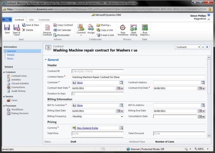 As an example I will be creating a contract for a customer who has purchased a washing machine and wishes to have a repair contract. I will be creating the contract from an existing repair contract for the same product. Below are the steps to achieve this.