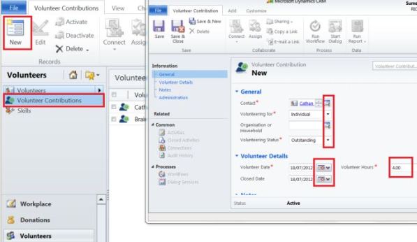 Let’s have a look at how volunteers are recorded in RIC. To enter in a volunteer record, we want to make sure we are under “Volunteer Contributions” tab. Once we are here we can start off by clicking “New”, which will open up a new window. Here we can start filling out the general details as required - under “Volunteer details” we can select the required dates and enter the amount of hours our volunteer is willing to volunteer for.