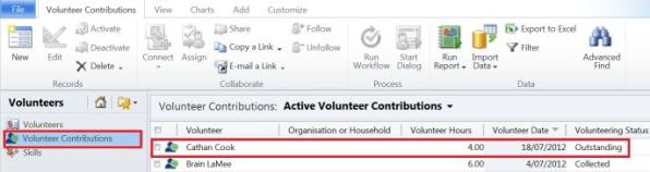Once we are done filling out the form, we can “Save & Close” it, this will now appear under “Volunteer Contributions” screen in detail. Here is a snapshot of what this looks like. And once Cathan has completed his time we can change the donation status to “Collected” – easy as that.