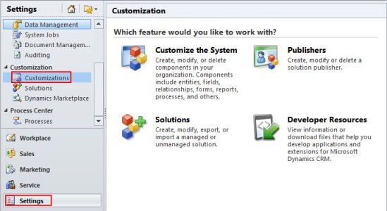 For System Charts and Dashboards, first you need to go to the customization area of your CRM, by going to “Settings -> Customizations”,