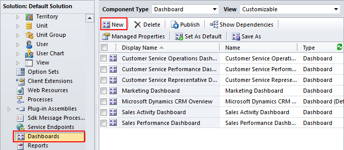 Pretty similar to System Charts, if you want to create a System Dashboard, click “Dashboards” in the main customization page, then click “New” to create your own System Dashboard.