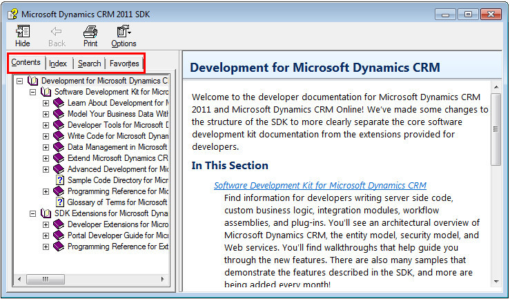 The next thing I will show you is the main documentation in SDK, which is the “crmsdk2011.chm” file, which you can locate in your SDK root folder. If you open it, it should looks like this: