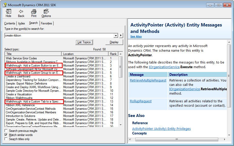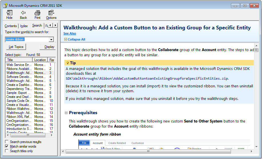 Here I have highlighted 3 topics, as they belong to the Walkthrough series, which are some very detailed and step-by-step instructions showing you how to do specific tasks. Those 3 topics will show us how to customize CRM 2011ribbon in 3 different scenarios. If you double click the first topic, the tutorial will be opened on the right:
