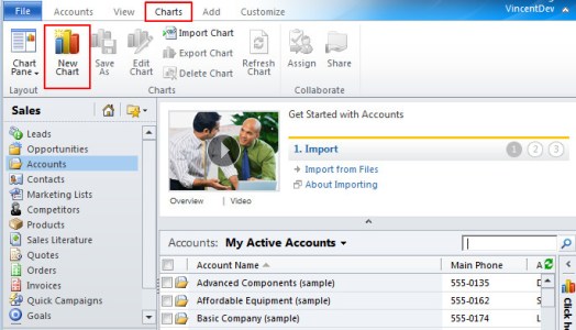 Next I will show you how to create Personal Chart. Create Personal Chart is easier and more straight forward, as you don’t need to go into the Customization page. I will use entity Account as example. First we click “Sales -> Accounts”, we will see a list of accounts, like this: