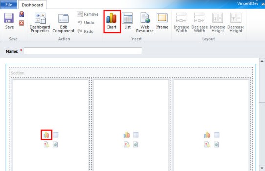 Depending on the layout you chose, you might see a slightly different screen, but the way to add component into Dashboard is the same. You can insert 4 types of components into Dashboard, which are Charts, Lists, IFrames and Web Resources. I will show you how to add Chart into Dashboard as example.