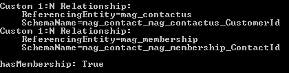 3. For each 1-to-Many relationship, if it is a Custom relationship, print out the Reference Entity and Schema Name. If its Reference Entity equals “mag_membership”, then we know the relationship, which we are looking for, exists in current Dynamic CRM 2011 instance. Set “hasMembership” to true.bool hasMembership = false;